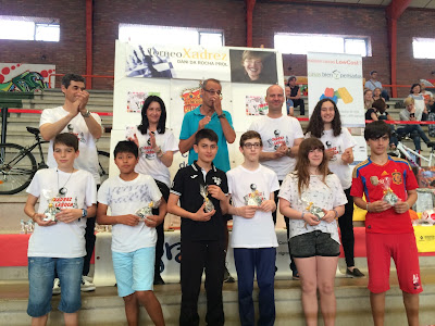 El campeón de la categoría fue Buitron Ramil David de Xadrez Gallaecia, también líder actual del Circuito Escolar, que se mantuvo imbatible durante todo el torneo. Le siguieron en la clasificación con 5,5 puntos Perez Dapoza Cesar de Casa da Xuventude y Rodriguez Ferreiros Andres del CX Fontecarmoa.  El cuarto clasificado con 5 puntos fue el también ourensano Diaz Gomez Mateo y en quinto lugar se clasificó el santigués Giron Hermo Xabier del ADM Peleteiro.  El local Bringas Gomez Artai vuelve a quedar entre los 10 primeros demostrando su talento y potencial. Damos la enhorabuena a todos los participantes y especialmente a los ganadores que se llevaron el velero.